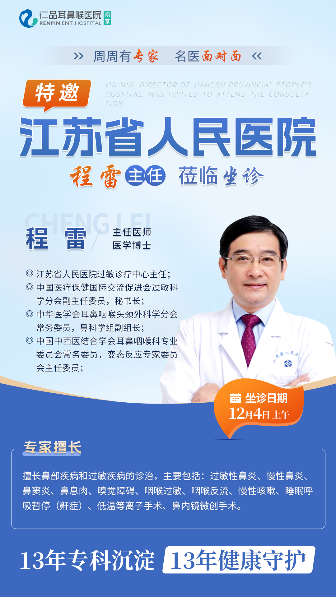 提醒:如果出现反复鼻塞、流涕、打喷嚏,特别是季节性或接触特定物品后加重,建议及时就诊。仁品整合脱敏中心特聘程雷教授作为首席专家顾问,12月4日上午到院坐诊,机会难得,不要错过~