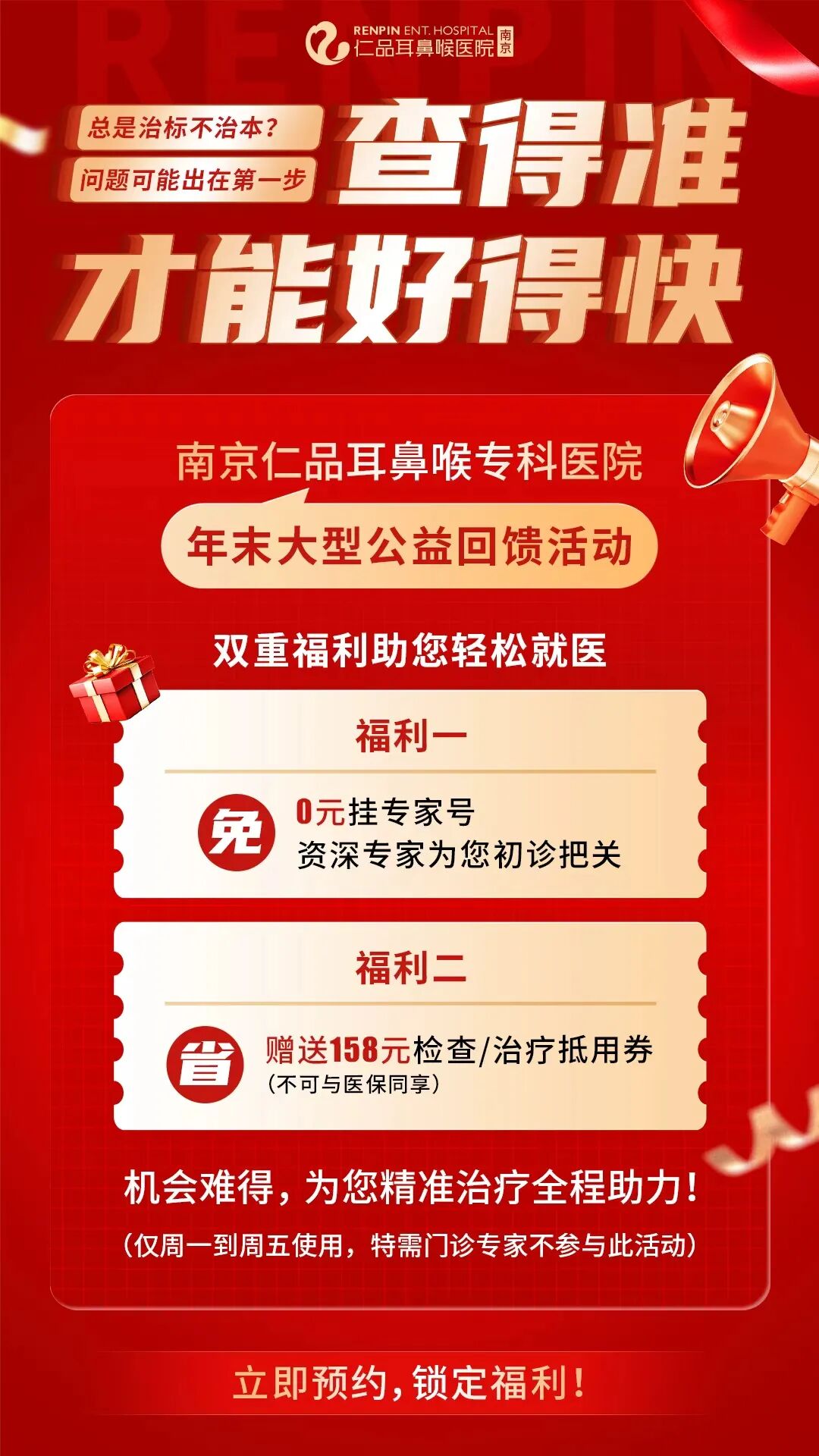 耳鸣困扰的夜晚,孩子反复的鼻塞咳嗽,或是术后恢复的焦虑,都不应被带入新的一年。作为深耕耳鼻咽喉头颈外科领域13年的专科医院,南京仁品始终记得每一位患者的期盼。值此岁末,我院特别推出年末大型公益回馈活动,用双重福利,为您和家人的健康保驾护航,让您轻松就医,安心迎新!
